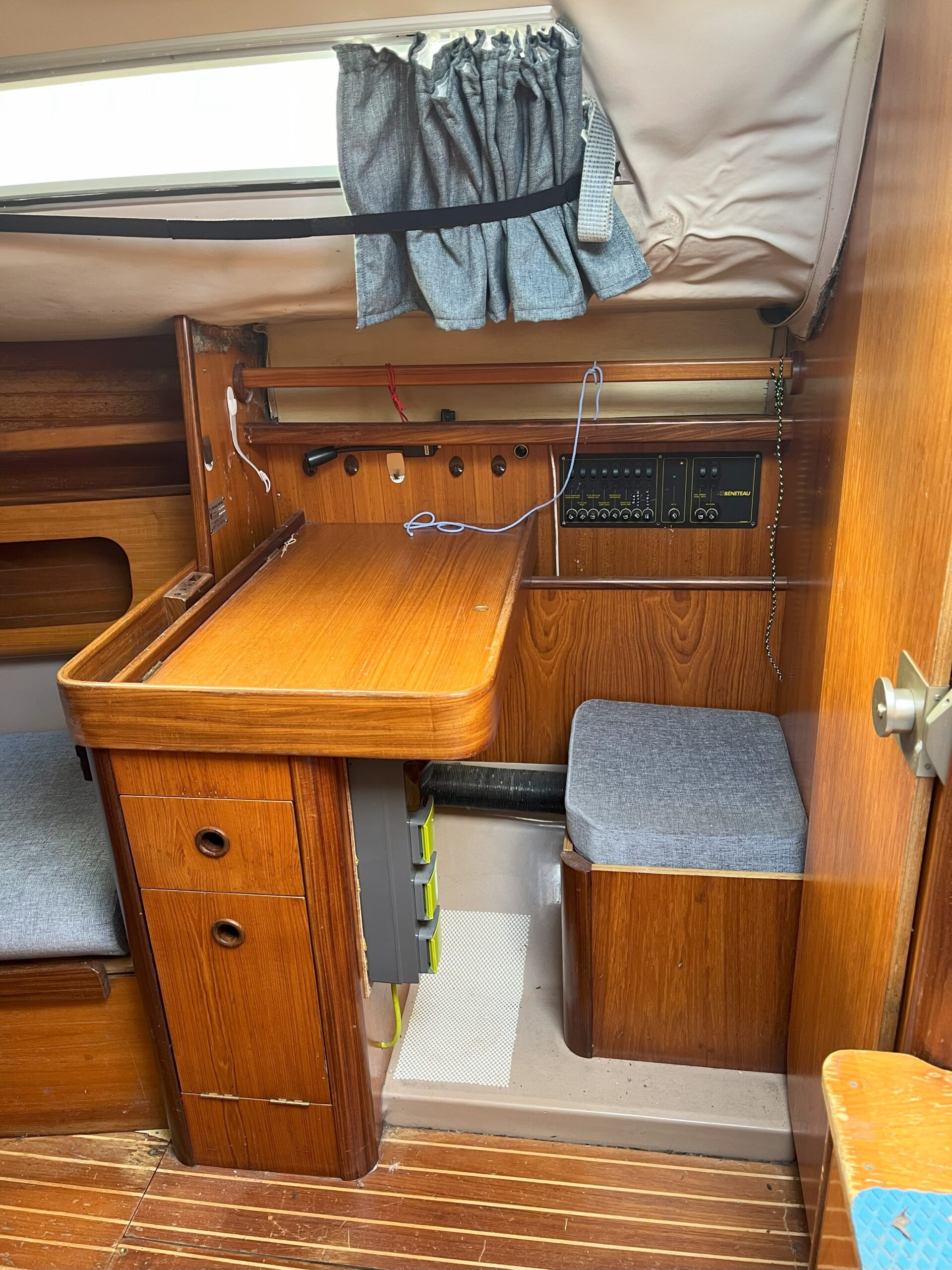 Forward fitting chart table with seat (storage below) and chart storage. 12volt panel at navigation area.