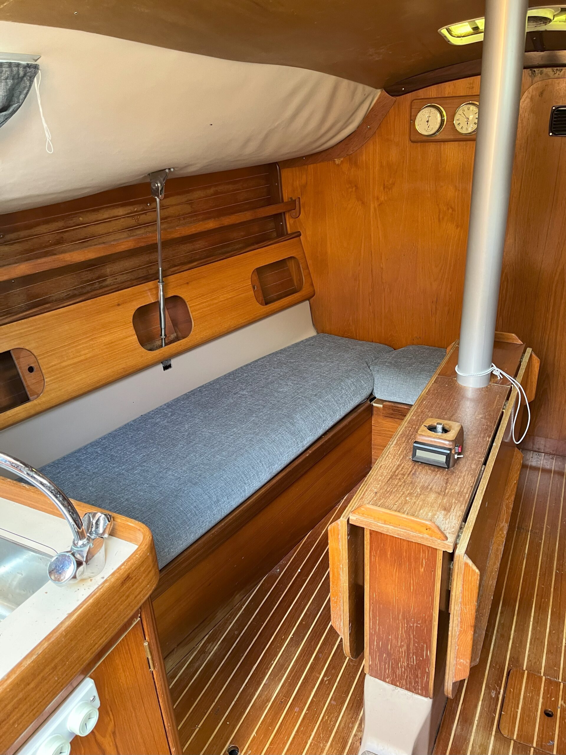 Sleeps six. Double berth in aft cabin with storage. Forward cabin with double berth and storage. Main saloon with central table with drop leaves. Settee berth both port and starboard with storage below and to the side. Main cabin professionally reupholstered in 2018. Galley area with Origo 3000 spirit stove, fitted 2016. Stainless steel sink with hot and cold water. Top loading ice box. Storage below sink, also above and below stove. There is a fitted gas alarm.